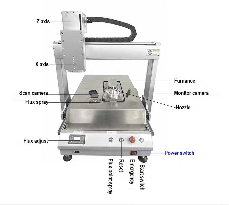This desktop selective wave soldering machine controls programming through an industrial computer and quickly inputs PCB board data into the computer through visual scanning.